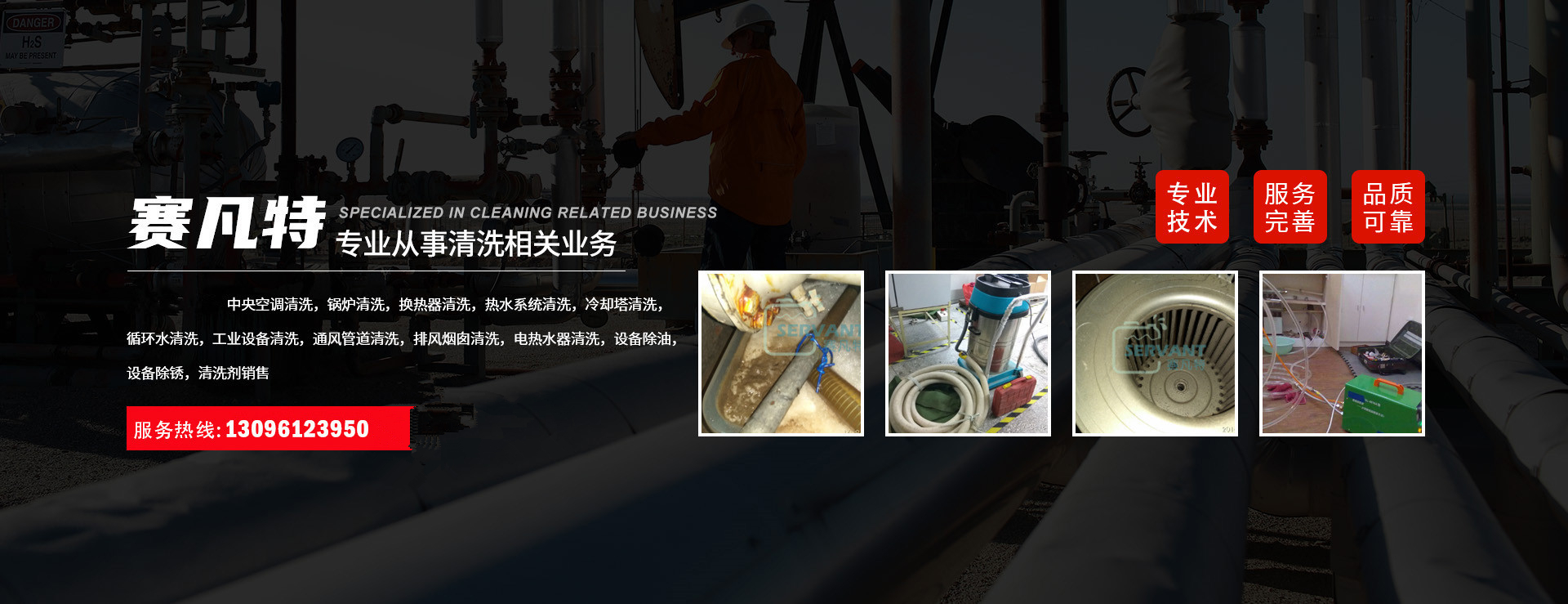 我公司清洗范圍包括:家用制冷設備清洗,中央空調清洗,鍋爐清洗,換熱器清洗,熱水系統清洗,冷卻塔清洗,循環水清洗,工業設備清洗,通風管道清洗,排風煙囪清洗,電熱水器清洗,設備除油,設備除銹,清洗劑銷售。
